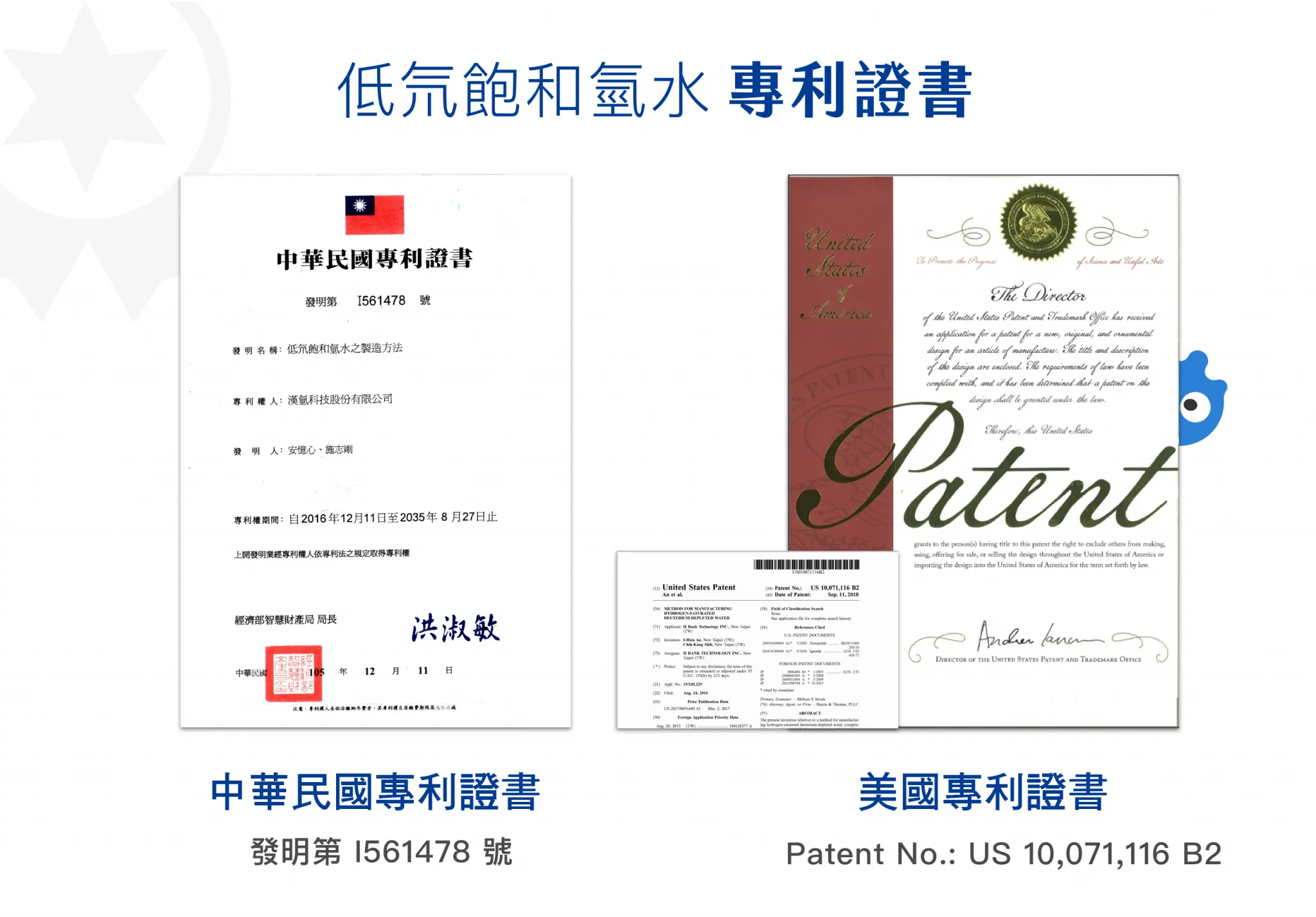 專利 7 日製程將超高純水製成低氘水( 110 ppm ),再經 30 日製程將 110ppm 低氘水物理溶解 8N 高純氫氣至穩定飽和。
